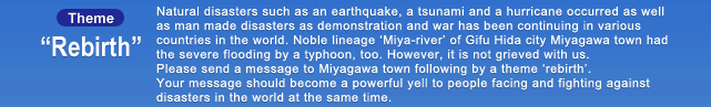 Your entry will be considered as your message to Miyagawa Town, and therefore it will not be returned. If necessary, please make a copy before you send your work.