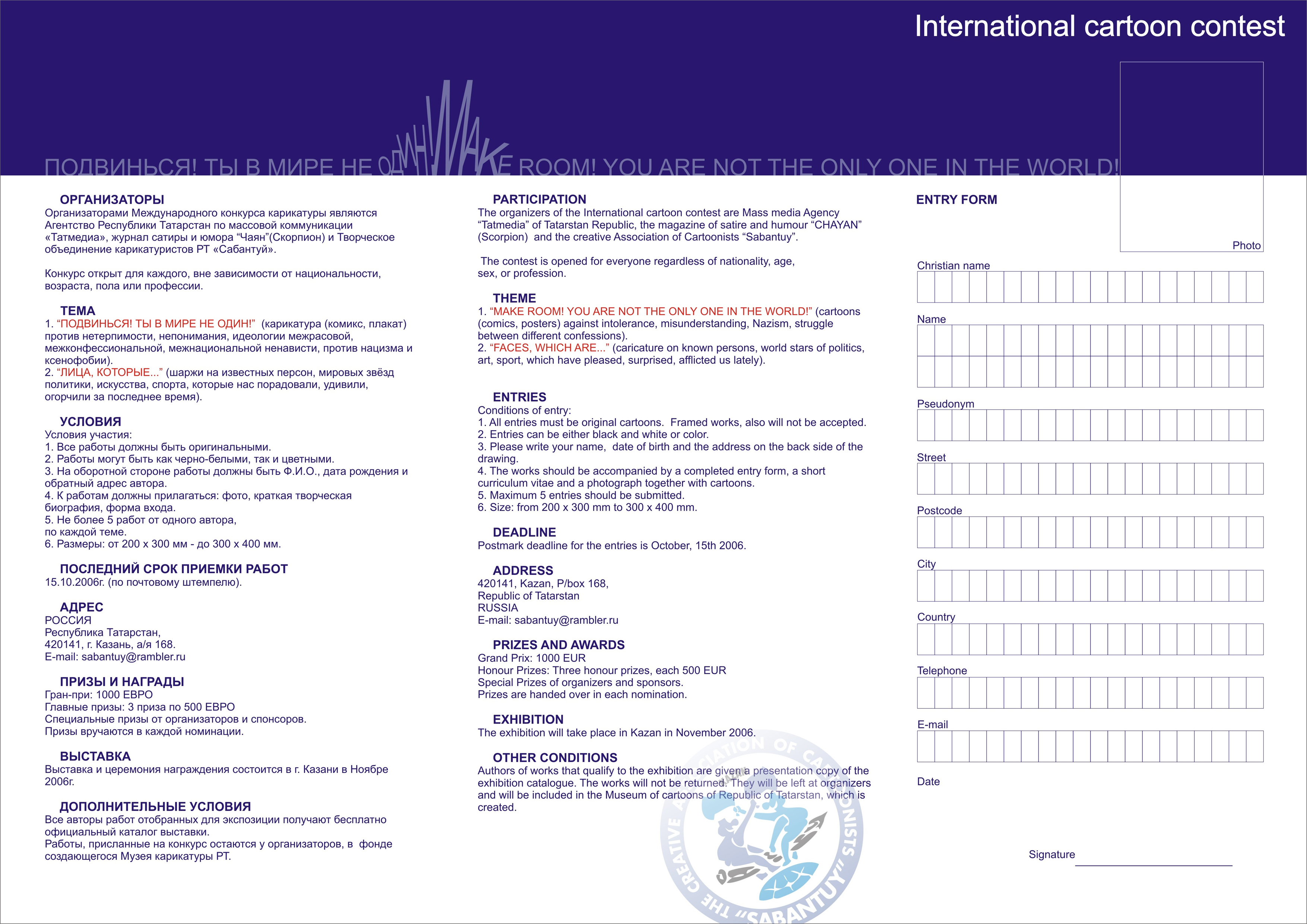 The organizers of the International cartoon contest are Mass media Agency "Tatmedia" of Tatarstan Republic, the magazine of satire and humour "CHAYAN" (Scorpion) and the creative Association of Cartoonists "Sabantuy".