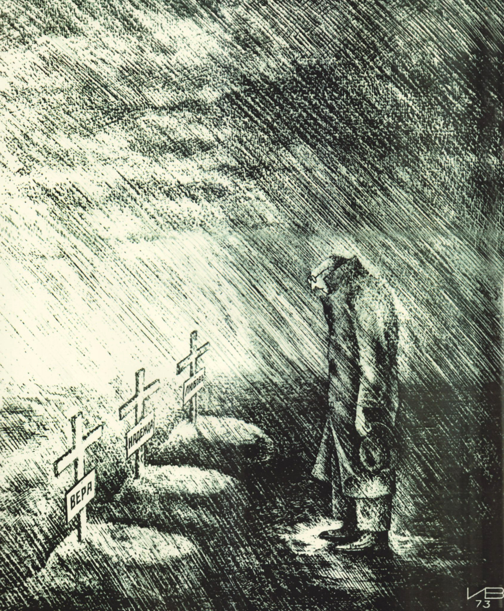 После него осталось около пятисот опубликованных на шестнадцатой полосе «ЛГ» рисунков - притч и ... воспоминания, рассказы-легенды о его пропавших работах. Они потеряны, уничтожены автором в минуты забытия, раздарены, пропиты, проданы за рубль... растащены запасливыми поклонниками.